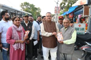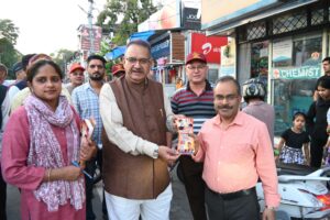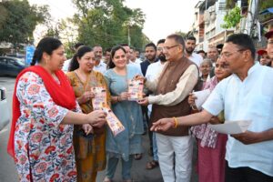 प्रधानमंत्री नरेन्द्र मोदी के उत्तराखण्ड आगमन पर हाथीबड़कला बाजार में जनसंपर्क कर निमंत्रण देते कृषि मंत्री गणेश जोशी